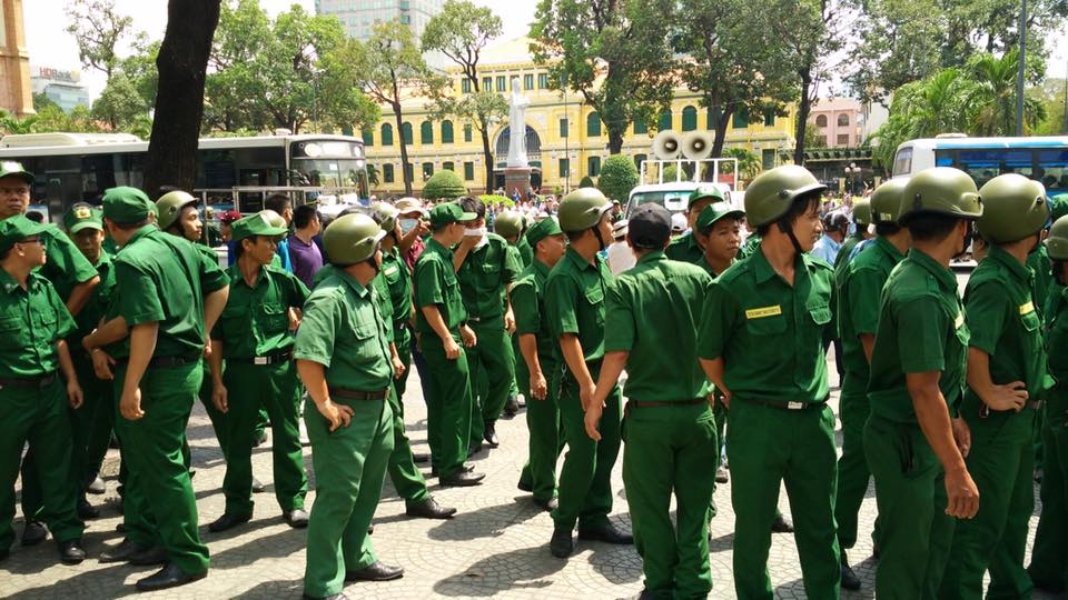 Có một tay thanh niên mặt thường phục, mặt mày hợm hĩnh cứ chỉa máy quay (có lẽ để quay từng gương mặt ). Người nào cãi lý, hô hào nhiều thì anh ta cố ý chỉa máy quay như hăm doạ. Có hai phụ nữ do tranh luận cũng như đòi hỏi công lý bị lôi đi. Mọi người đồng lòng chống lại thì bị cảnh sát cơ động khống chế để lôi hai người phụ nữ lên xe cảnh sát đi đâu không rõ.