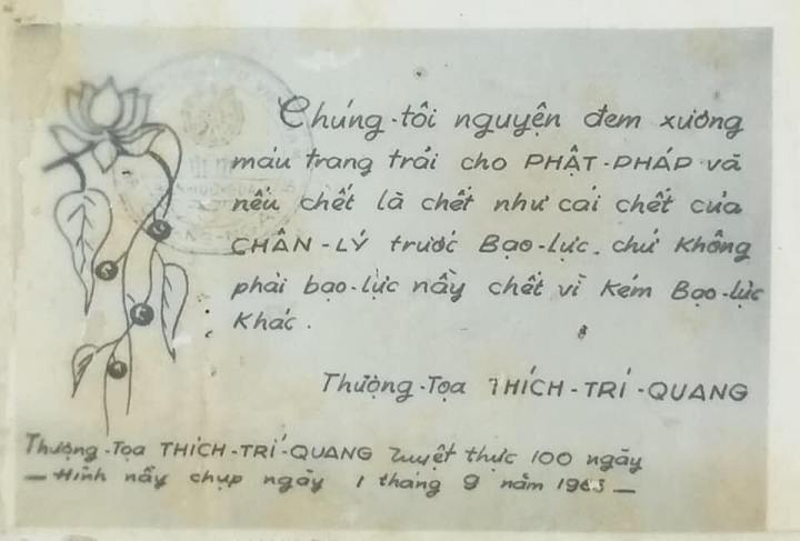 Xin được giới thiệu bức phóng ảnh của bản kiến nghị Thượng Tọa Thích Trí Quang gửi cho Tổng Thống Ngô Đình Diệm vào tháng hai năm 1956, yêu cầu Tổng Thống Diệm tiếp tục công nhận Phật Ðản là một ngày lễ chính thức hằng năm của nước Việt Nam Cộng Hòa như Phật Ðản đã từng được công nhận trong nước Quốc Gia Việt Nam do Quốc Trưởng Bảo Đại cầm đầu: