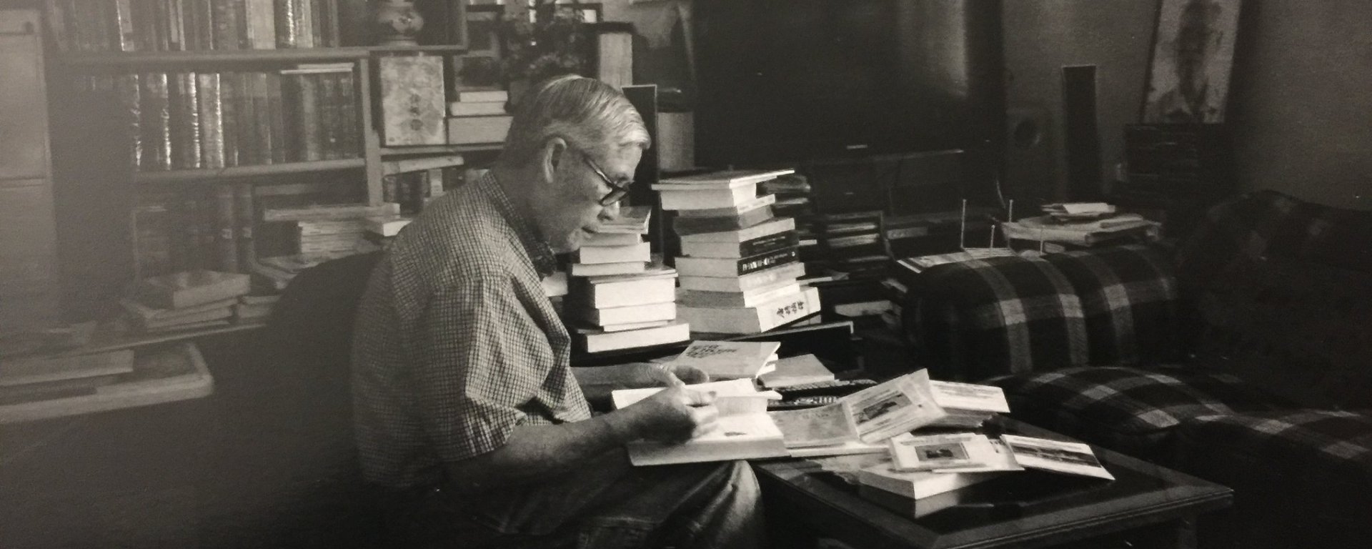 Nhà anh là một thư viện. Đó là nói về số lượng sách. Nhưng cam đoan không có cái thư viện nào bề bộn như vậy. Trong căn nhà nhỏ, sách lấn người. Phòng khách của anh tứ bề là sách. Vài chiếc kệ sách èo uột, khặc khè ôm sách, đứng sát vách tường như e dè với từng chồng sách chênh vênh trên bàn, trên ghế. Trong các phòng khác, sách cũng chiếm thế thượng phong. Ngoài hành lang, sách cũng lủ khủ trong những thùng giấy mà những khi mưa gió, anh phải di chuyển để sách khỏi ướt. Nhà chỉ có hai vợ chồng nhưng sách của anh coi bộ làm bá chủ. Chị nói nhỏ với tôi: “Chi chứ sách của anh là không bao giờ được đụng tới!”. Sách được thể lên chân lên cẳng.