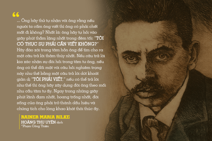 Ông hỏi tôi để biết những vần thơ của ông làm có khá không. Ông hỏi điều ấy với tôi và trước đó, ông đã hỏi điều đó với những kẻ khác. Ông đã gửi những bài thơ đó cho những tạp chí. Ông so sánh những bài thơ của ông với những bài thơ khác và ông cuống lên khi những người chủ biên của tạp chí vứt bỏ những nỗ lực làm thơ của ông. Vì ông đã tỏ ra không ngại lời khuyên giải của tôi, vậy từ nay trở đi tôi xin ông đừng làm những việc như vậy nữa. Ông đang soi cái nhìn của ông ra bên ngoài; đó là điều ông không nên làm. Không có người nào có thể đem đến cho ông lời khuyên giải hay sự giúp đỡ, không có ai cả. Chỉ có một con đường duy nhất là ông hãy đi vào sâu bên trong tâm hồn của ông, tìm hiểu, tìm kiếm nhu cầu duyên do bức bách đã khiến ông sáng tác, đã xui ông viết lách: hãy tìm hiểu xem việc ấy có ăn rễ sâu thẳm trong lòng ông hay không. Ông hãy thử tự nhận với ông rằng nếu người ta cấm ông viết thì ông có phải chết mất đi không? Nhất là: ông hãy tự hỏi vào giây phút thầm lặng nhất trong đêm tối: “Tôi có thực sự phải cần viết không?” Hãy đào xới trong tâm hồn ông để tìm cho ra một câu trả lời thâm thúy nhất. Nếu câu trả lời kia xác nhận sự đòi hỏi trong tâm tư ông, nếu ông có thể đối mặt với câu hỏi nghiêm trọng này như thế bằng một câu trả lời dứt khoát giản dị “Tôi phải viết”, nếu có thể trả lời như thế thì ông hãy xây dựng đời ông theo mối nhu cầu tâm tư ấy. Ngay trong những giây phút lạnh nhạt nhất, hoang trống nhất, đời sống của ông phải trở thành dấu hiệu và chứng tích cho lòng khao khát thôi thúc ấy.